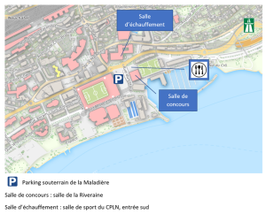 L’emplacement des installations vous est indiqué sur le plan ci-dessous. La salle de la Riveraine se situe à l’entrée de la ville de Neuchâtel (sortie 13 direction Neuchâtel-Maladière). Un grand parking sous-terrain se trouve juste à côté de la salle (parking Maladière centre). Une salle d’échauffement est également mise à disposition des gymnastes, qui devront traverser la route et se rendre dans la salle de sport du CPLN (entrée sud). A l’entrée de la salle de concours, vous trouverez une cantine pour vous restaurer tout au long du week-end. D’excellentes grillades (steaks vigneron, saucisses de veau, Wurst abeille) mais également des frites, salades, crêpes (sucrées et salées) ou encore des pizzas et sèches au lard vous attendent ! La liste des prix est disponible en cliquant sur le lien suivant : Liste des prix